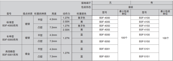 下面重點介紹歐姆龍輕觸開關(guān)B3F系列,包含基板插入安裝型,6mm方形,12mm方形及橫向操作型、鍍金接點、徑向帶裝型等。其特點如下: