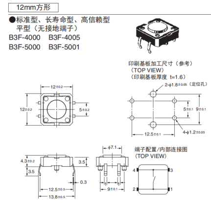其中12mm方形(如下圖)主要包含有標(biāo)準(zhǔn)型B3F-4000系列,長壽型B3F-5000系列和高度賴型B3F-5001系列。具體額定值及性能歡迎登錄廣州鼎悅電子科技有限公司官方官網(wǎng)進(jìn)行查閱和咨詢。