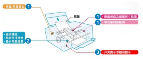 2、進(jìn)紙感應(yīng)會(huì)用到反射式光電開(kāi)關(guān),主要起到的作用是檢測(cè)紙張尺寸以及墨水。