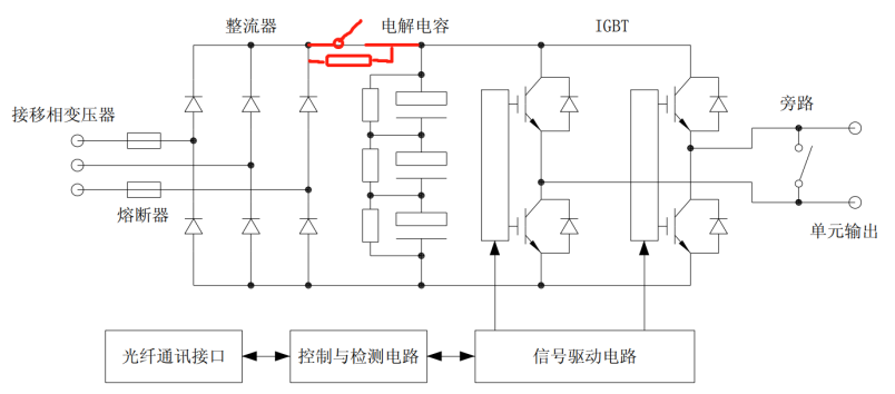 在整個(gè)串聯(lián)過程中,我們不得不聊到的,如何實(shí)現(xiàn)各串聯(lián)單元的節(jié)能效果。是否能在每個(gè)串聯(lián)單元內(nèi)加入繼電器,進(jìn)行旁支接入,從而解放前端整流器持續(xù)輸入的效果,實(shí)現(xiàn)后端電解電容的輸入輸出使用繼電器進(jìn)行控制,從而達(dá)到節(jié)能效果。如下圖所示: