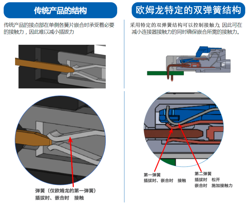 特征1其特點雙彈簧結構:在嵌合時通過第一彈簧和第二彈簧的接觸合力確保接觸可靠性,并在插拔時通過操作手柄打開第二彈簧來減小插拔力。如下圖