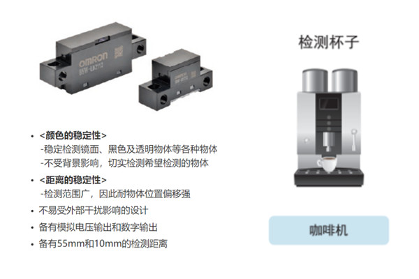 歐姆龍限定反射型傳感器B5W應(yīng)用在咖啡機(jī)中,這個系列的傳感器具有哪些特點呢,如下: