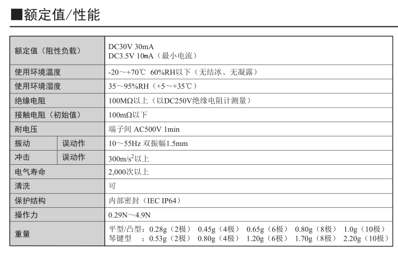 相當于密封構造IP64(IEC-60529)防止焊劑浸入,即使在塵埃較多或有水的地方使用也 能確保高接觸可靠性。
