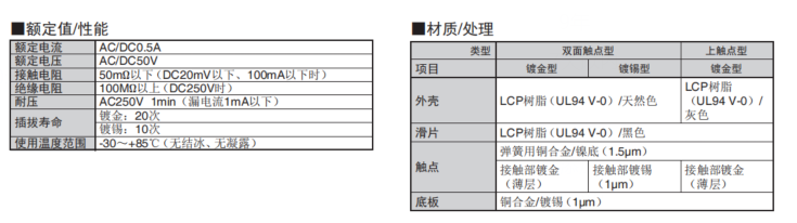 接點構造備有雙面觸點型和上觸點型兩種。 (上接點型只有0.5mm間距)